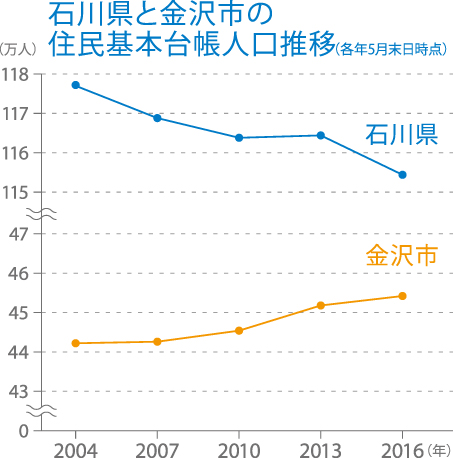 今年5月末日時点の住民基本台帳月報によると、石川県の人口は前年から3068人減少して115万4400人となりました。一方、県人口の4割を占める金沢市では773人増加の45万4269人に。同市では死亡数が出生数を上回る自然減の状態に2012年から転じていますが、転入が転出を上回る社会増が08年から続き、人口減少の勢いを押しとどめています。