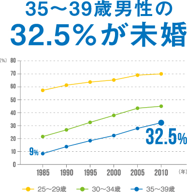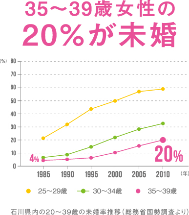 総務省の国勢調査によると、石川県内の20~39歳の未婚率は、1985年以降、男女とも顕著に上昇を続けています。直近の2010年のデータでは、30代後半の男性で3人に1人(32.5%)、女性で5人に1人(20%)が未婚の状況です。1985年と比べると、男性で約4倍、女性で約5倍になっています。